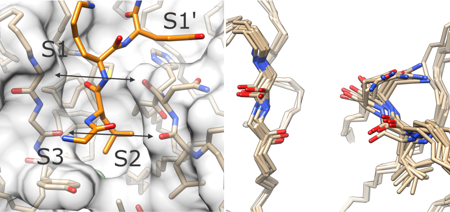 (left) The T and R states differ in the width of the active site cleft around subsites S1 and S2. (right) Ensemble of conformations of loops lining the S1-S2 cleft in human cathepsin K.