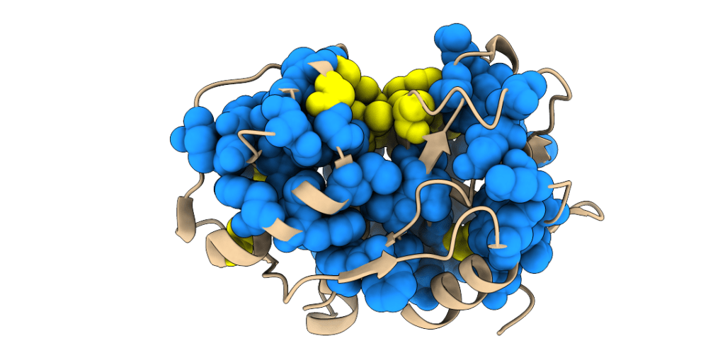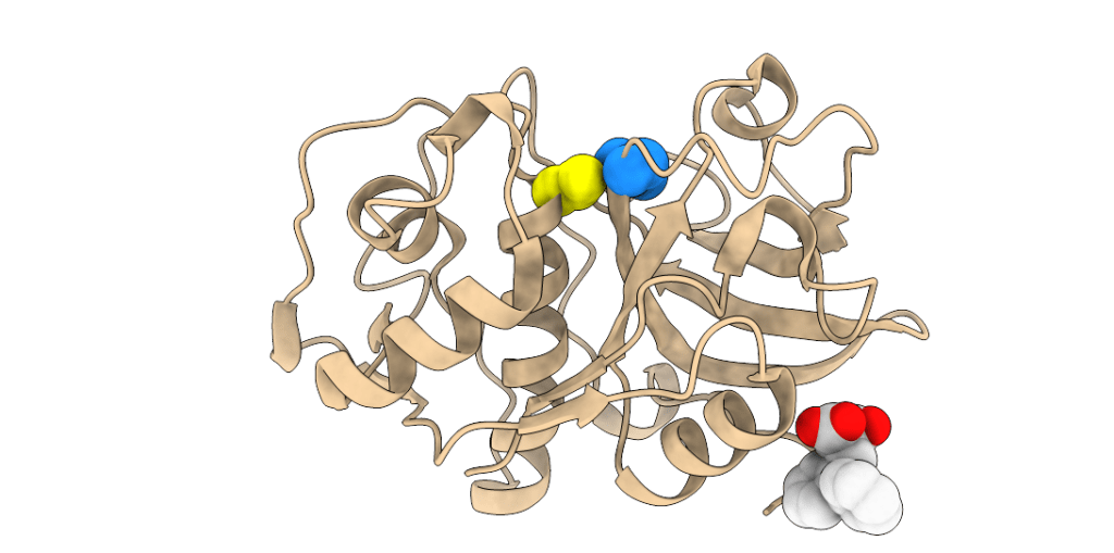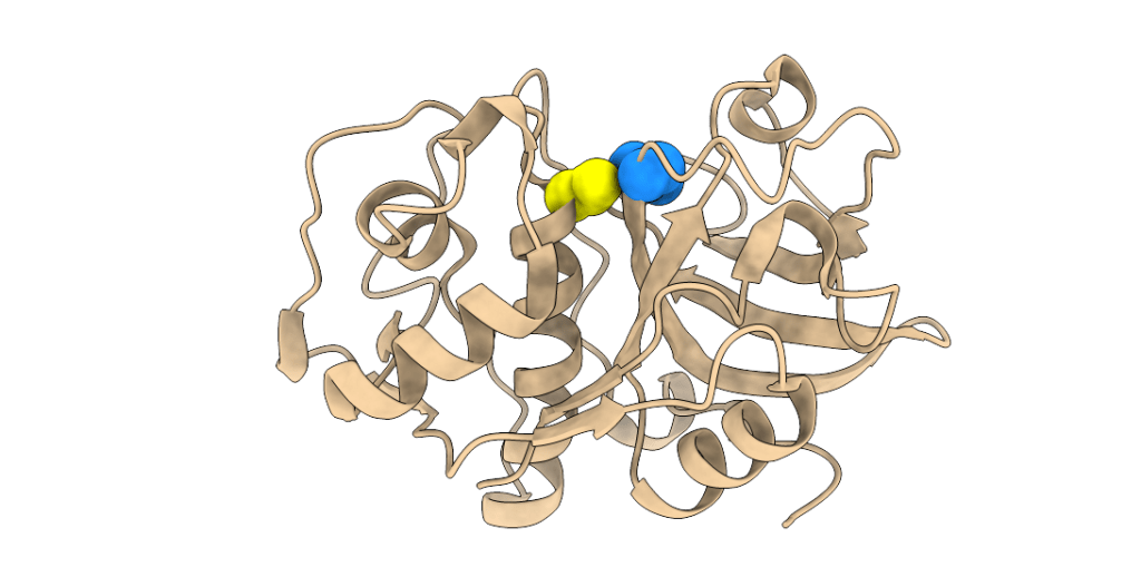 Three-dimensional structure of a papain-like peptidase. Cys and His residues of the catalytic diad are shown as yellow and blue spheres, respectively.